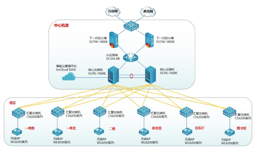 为方便用户对无线管理和维护,提升用户无线体验,使无线更智能化,此次采用南宫NG28官网智能云管理平台ImCloud 8260实现无线统一的管理、维护、认证,并可实现对全网无线设备管理、实现易部署、易维护、易扩展的无线网络。南宫NG28官网云管理ImCloud方案是网络服务的新模式,基于云端实现网络服务和管理,将复杂的网络管理简单化、智能化、可视化,提升用户网络体验。同时为了保证无线的安全,无线采用Portal准入认证,云管理ImCloud和南宫NG28官网身份认证系统DCSM-BR实现联动,用户需要顺利获得账号和密码认证成功后才能接入无线网络,在保证无线连接的便捷性同时兼顾无线的安全性。
