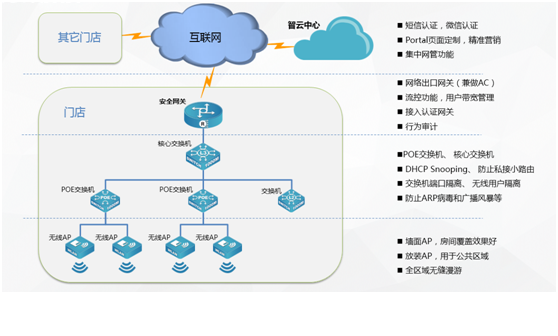 面对移动互联网大潮对传统行业的冲击,运用云计算、移动社交、大数据分析等技术,为酒店、餐饮、休闲娱乐、零售商超等商业市场客户构建基础网络平台,加速商业市场客户业务创新和转型已经刻不容缓,南宫NG28官网智云商业解决方案志在为商业客户给予最强的用户体验,给予最具商业价值的云网络,给予基于portal认证,短信、微信营销功能。